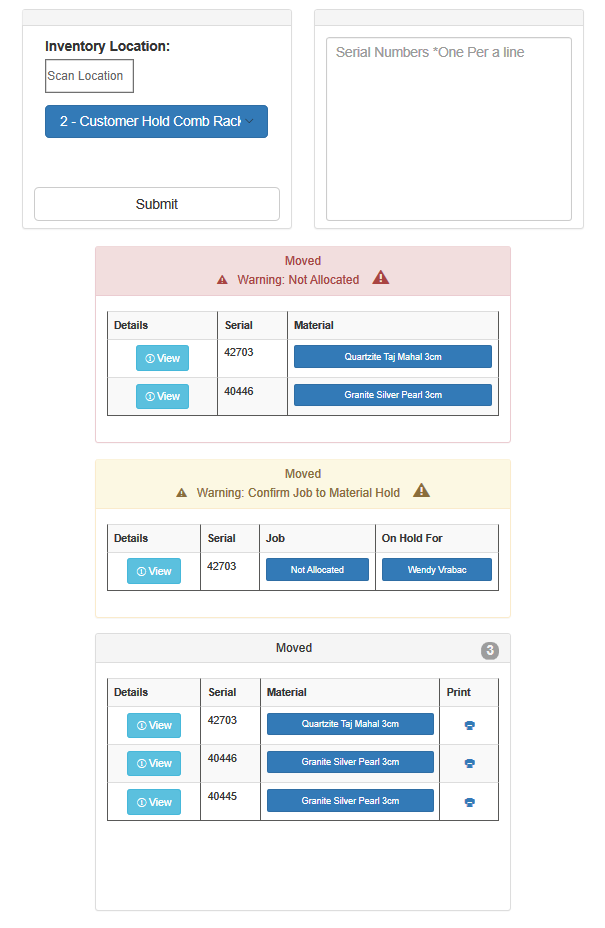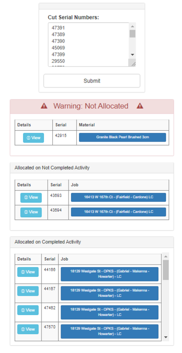 With Inventory Loop you can confirm the material your saw operator cut was actually allocated for that job. By having the saw operator log the serial numbers or save barcode stickers a verification process can be implemented. This will reduce errors and keep your inventory accurate.